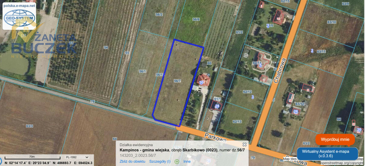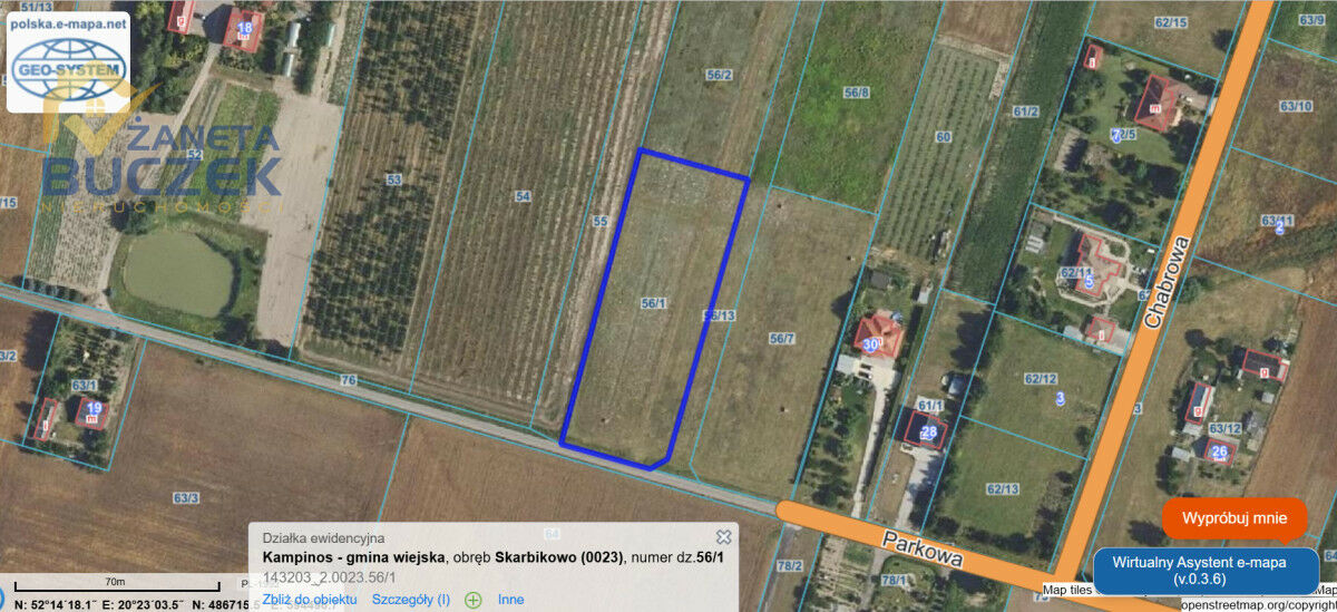 Sprzedam działki z warunkami zabudowy w miejscowości Skarbikowo, w gminie Kampinos.Dostępna jest działka nr 56/1 o pow. 4021 m2 i 56/7 o pow. 4044 m2. Działki są w kształcie prostokątów o wymiarach 106 m x 40 m. Położone są bezpośrednio przy drodze asfaltowej w której są media tj. prąd i woda.